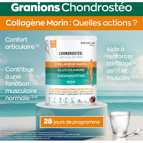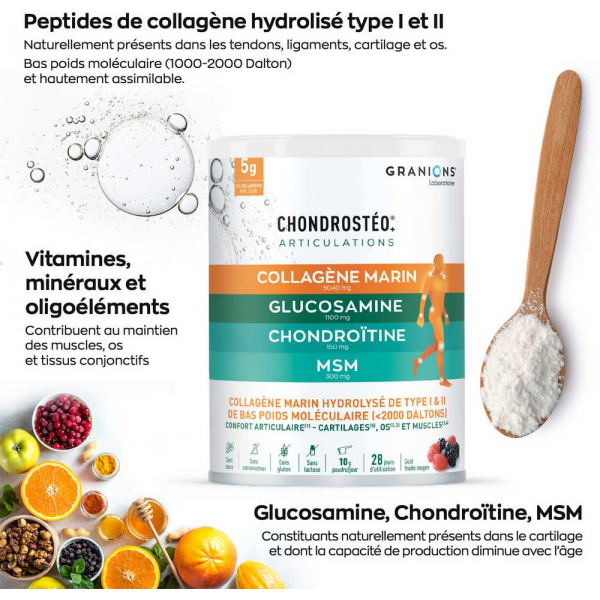 Ingrédients : Peptides de collagène hydrolysé (poisson), carbonate de magnésium, arôme fruits des bois, chlorhydrate de glucosamine (crustacés), citrate de calcium, méthyl sulfonyl méthane (MSM), chondroïtine sulfate, bambou (Bambusa arundinaea), gluconate de cuivre, édulcorant : sucralose, vitamine D3.
