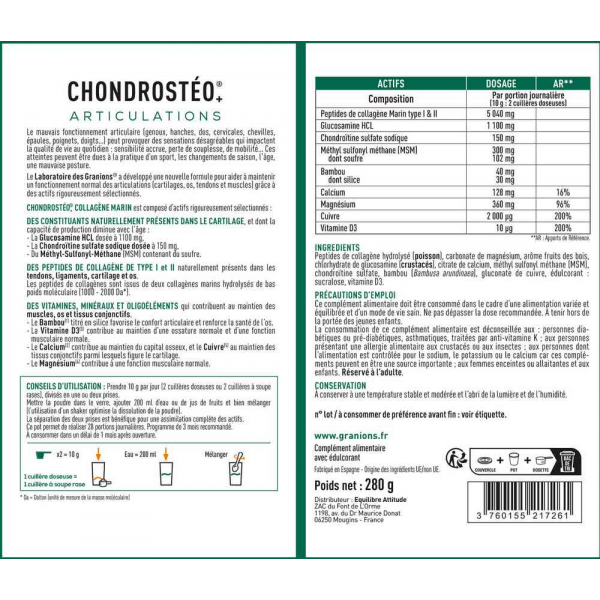 Chondrosteo + Collagene Marin est un complément alimentaire dédié aux articulations avec des constituants naturellement présents dans le cartilage, tendons et ligaments dont du peptide de collagene hydrolysé d'origine marine.