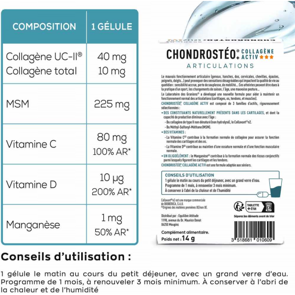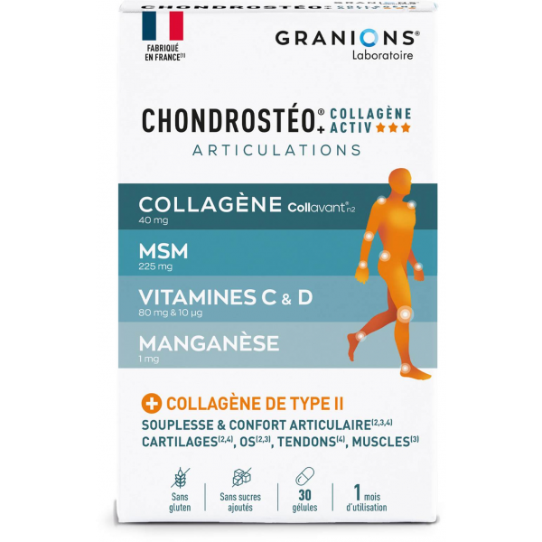 Granions Chondrostéo Articulations Collagène Activ est un complément alimentaire formulé à base de collagène, de vitamine C et D, de manganèse qui participe au fonctionnement normal des articulations.