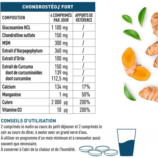 • DES CONSTITUANTS NATURELLEMENT PRÉSENTS DANS LE CARTILAGE : la glucosamine HCL dosée à 1100 mg, la chondroïtine sulfate dosée à 150 mg et le méthyl-sulfonyl-methane ou MSM, qui contient du soufre.