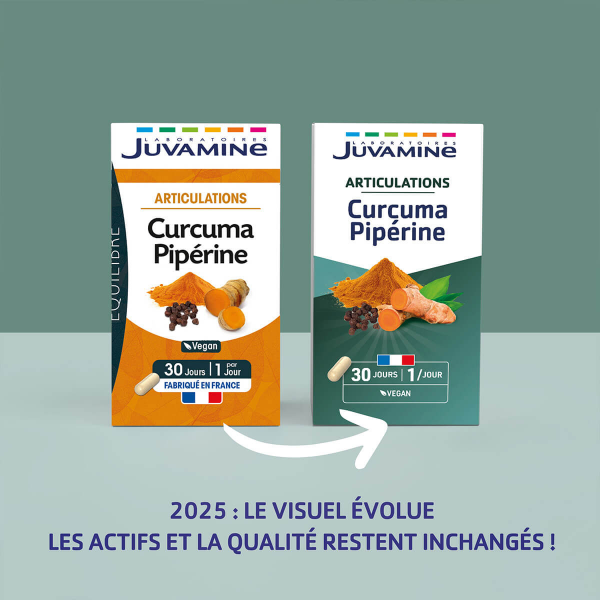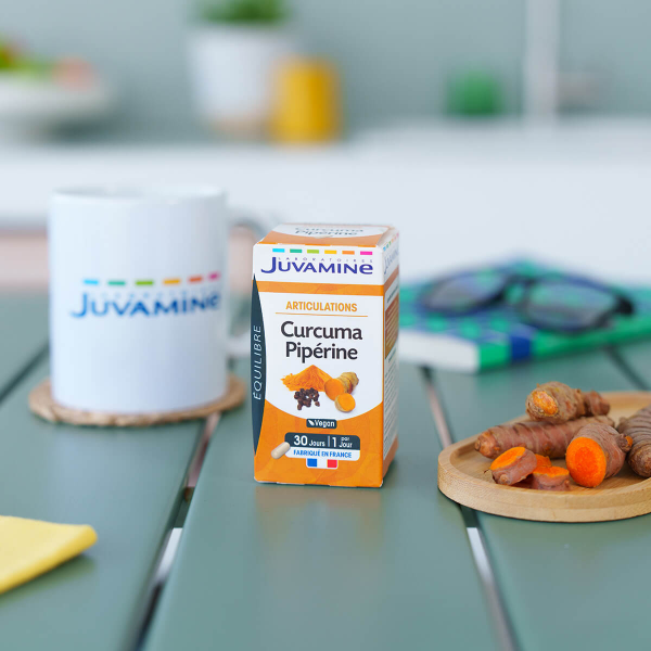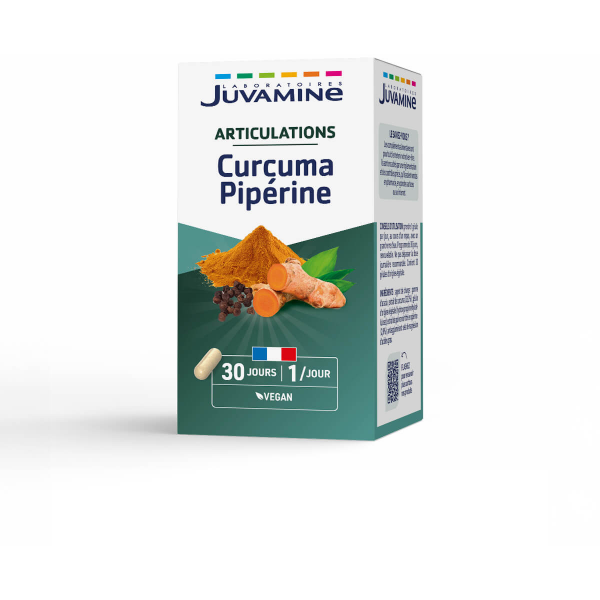 La formule des Laboratoires Juvamine est associé avec de la Pipérine, contenue dans le Poivre noir, qui permet à l'organisme de mieux intégrer la Curcumine, contenue dans le Curcuma.