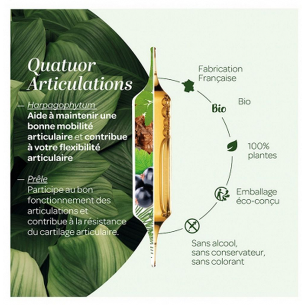 Extrait aqueux d’Harpagophytum* (racine), Prêle *(partie aérienne stérile), Cassis* (feuille), Frêne* (feuille).*Ingrédient issu de l'agriculture biologique.