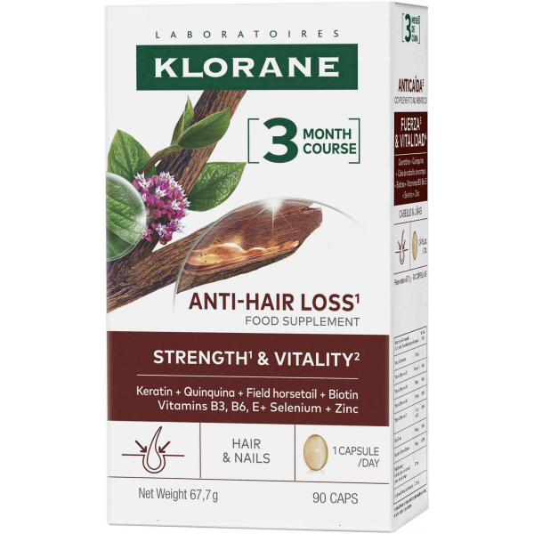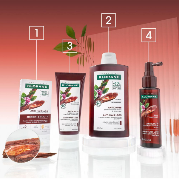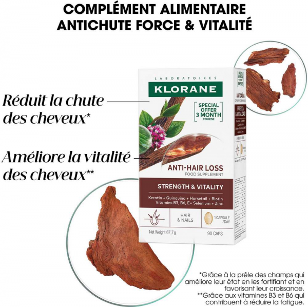 Klorane Antichute Force et Vitalité contient de la Kératine et des extraits de prêle des champs et quinquina. Il agit de l’intérieur pour prévenir la chute de cheveux et aider à maintenir des cheveux forts et en bonne santé. Idéal en cas de chute de cheveux, de cheveux dévitalisés et de cheveux fatigués.