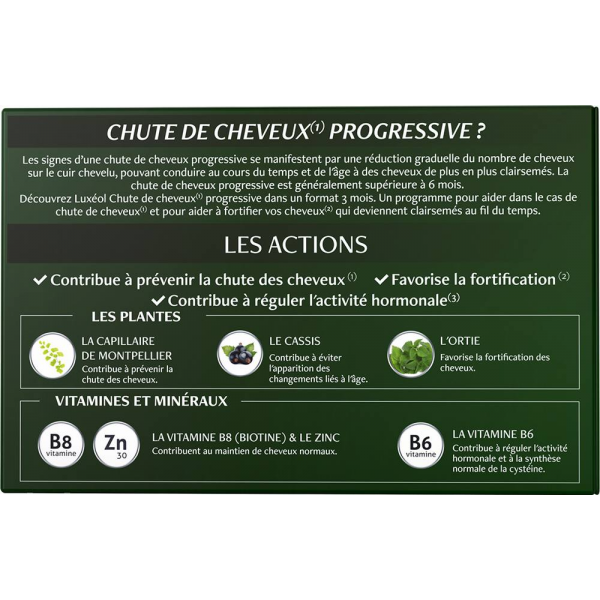 Découvrez Luxéol Chute de Cheveux Progressive dans un format 3 mois. Un programme pour aider dans le cas de chute de cheveux et pour aider à fortifier vos cheveux qui deviennent clairsemés au fil du temps.