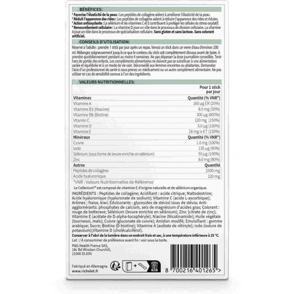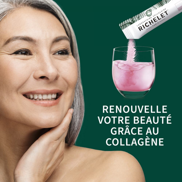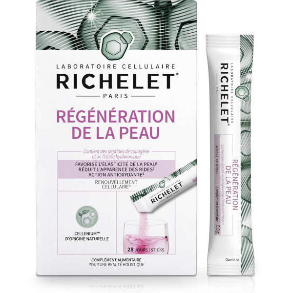 Les laboratoires Richelet proposent des sticks Régénération de la Peau, un complément pratique à dissoudre dans de l'eau pour une boisson savoureuse au goût fraise-kiwi. Enrichi en collagène, en acide hyaluronique et en Cellenium, ce produit vise à soutenir l'élasticité de la peau et à réduire l'apparence des rides.