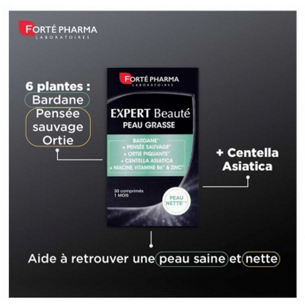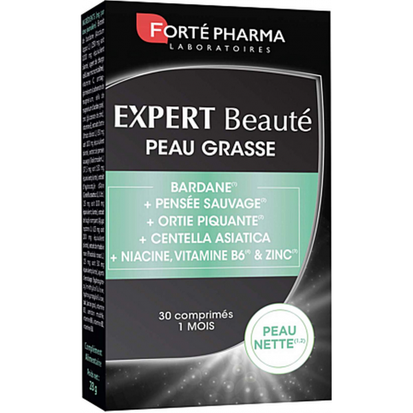 Forté Pharma Expert Beauté Peau Grasse est un complément alimentaire à la formule complète avec des actifs reconnus pour purifier la peau. En savoir +
