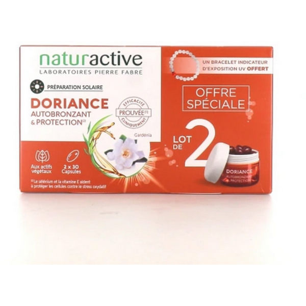 Doriance Autobronzant & Protection possède une double action : autobronzant grâce à ses 11 phytopigments sélectionnés pour un teint hâlé naturellement sans exposition au soleil & protection grâce aux antioxydants qui aident votre peau à mieux se protéger des agressions extérieures. Doriance vous offre cette année, un bracelet indicateur d'UV pour vous sensibilisez à votre exposition quotidienne.