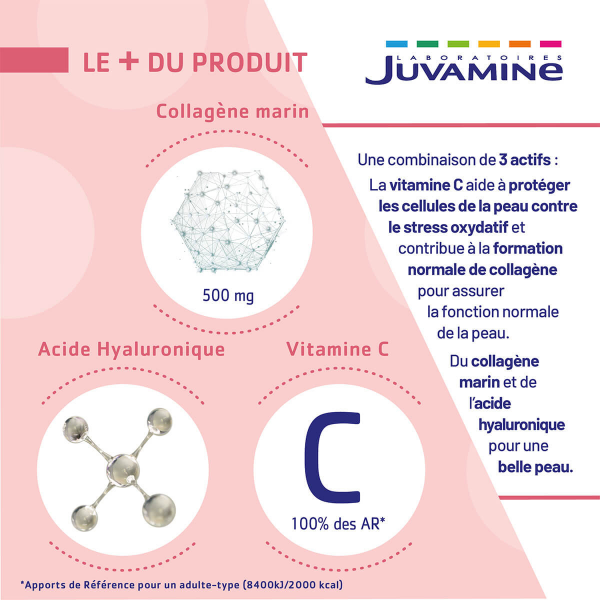 Hydrolysat de collagene marin (poisson) (45.5%) ; agent de charge : cellulose ; vitamine C ; hyaluronate de sodium (66%) ; antiagglomérant : sels de magnésium d-acides gras.