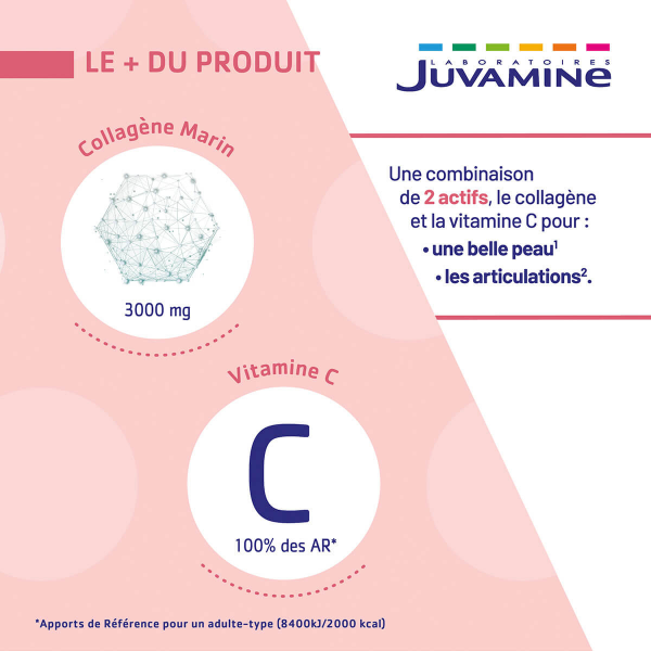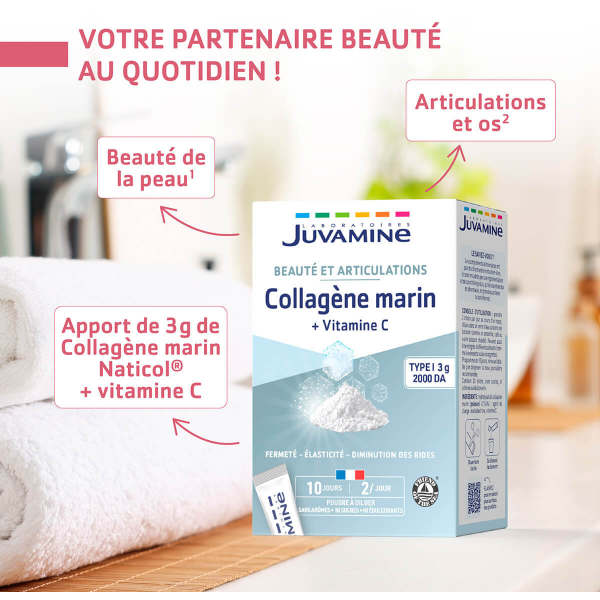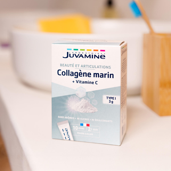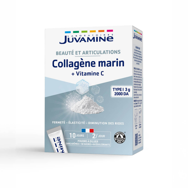 Le COLLAGÈNE MARIN 3000 mg de la marque Juvamine est une formule concentrée en collagène marin et en vitamine C spécialement élaborée pour prendre soin de votre peau et de vos articulations. Le collagène, constituant majeur de la peau et présent également au niveau des articulations, diminue naturellement avec l'âge. En complément, la vitamine C contribue à la formation normale du collagène, essentielle pour assurer la fonction normale de la peau. Avec le COLLAGÈNE MARIN 3000 mg, offrez à votre corps un précieux soutien pour maintenir la santé de votre peau et de vos articulations.