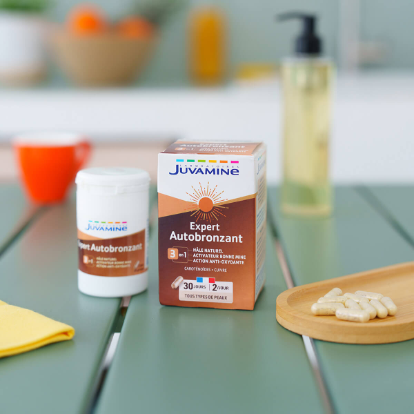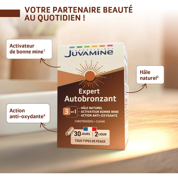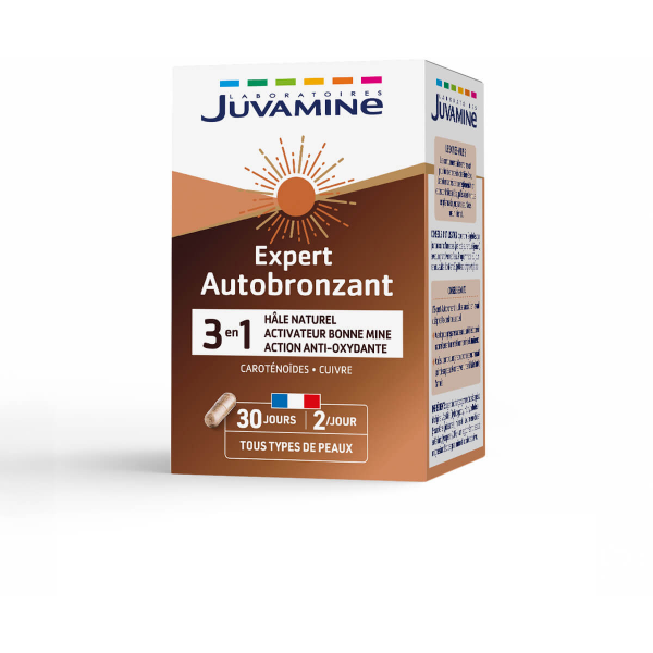 Complément alimentaire. Expert Autobronzant 3en1 : hâle naturel, activateur bonne mine, action anti-oxydante. A base de caroténoïdes et de cuivre. Destiné à tous les types de peaux. En savoir +