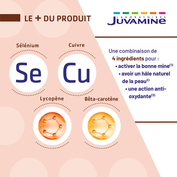 Pour 2 gélules Quantité % AR* : Béta-carotène 2,5 mg (417 µg ER) 52,1%, Lycopène 2 mg, Cuivre 0,5 mg 50%, Sélénium 55 µg 100%. *Apports de Référence.