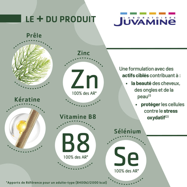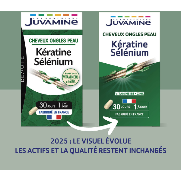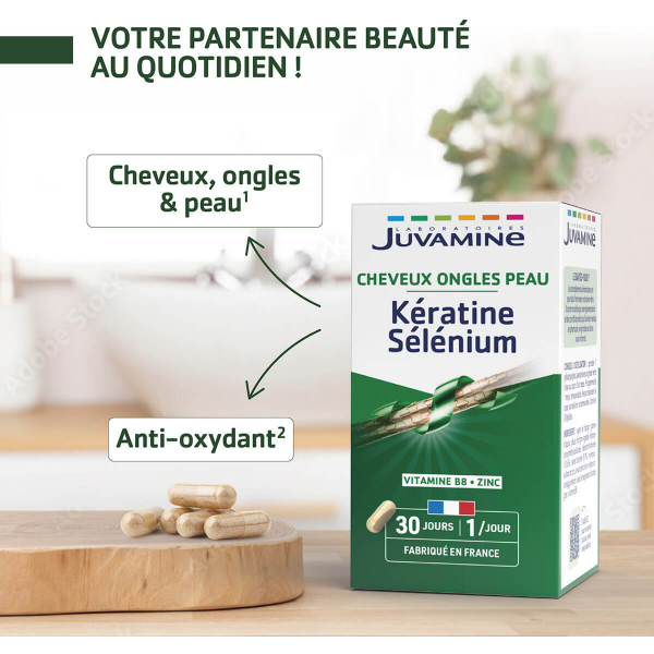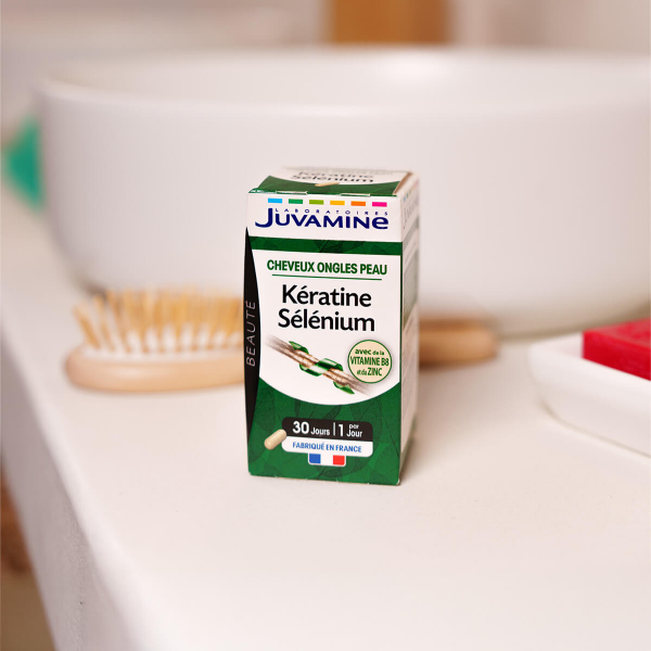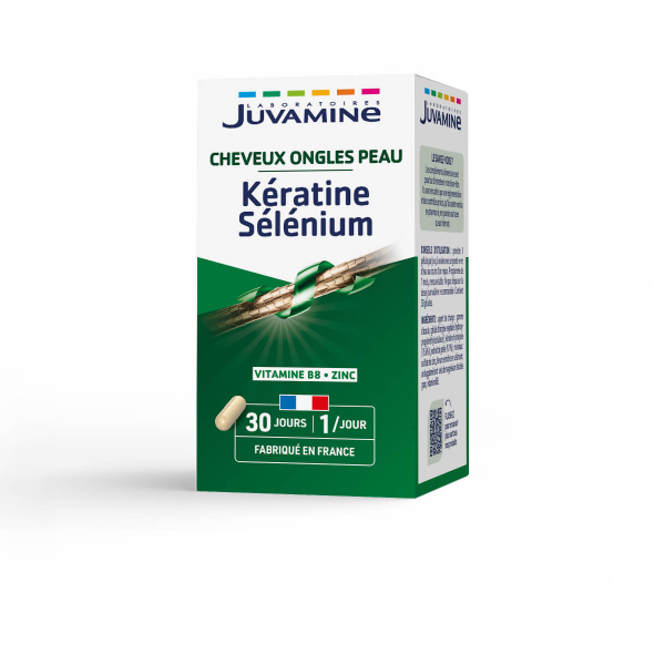 Découvrez les bienfaits de la Kératine Sélenium de Juvamine, une formule unique associant kératine d'origine naturelle et sélénium pour la beauté de vos cheveux et ongles. Enrichi en vitamine B8, zinc et prêle, ce complément alimentaire a été spécialement conçu pour offrir des résultats efficaces. Le sélénium protège les cellules contre le stress oxydatif, la vitamine B8 contribue au maintien d'une peau normale et de cheveux sains, tandis que le zinc soutient la santé de la peau, des cheveux et des ongles. Avec Juvamine, bénéficiez d'une expertise de plus de 30 ans dans les compléments alimentaires pour retrouver votre bien-être.