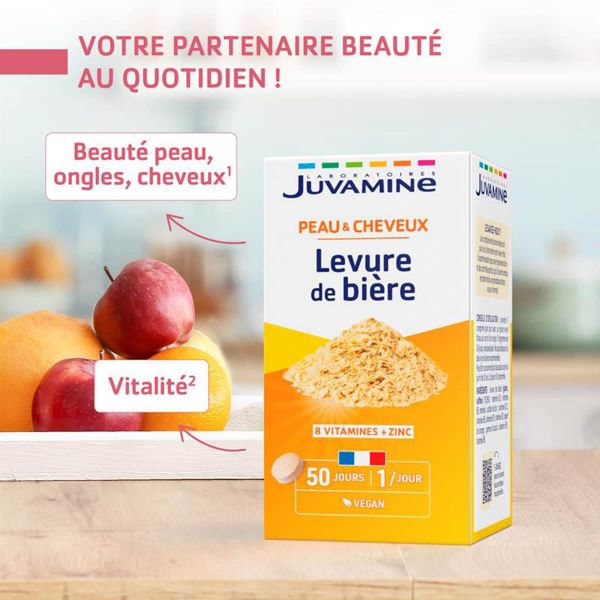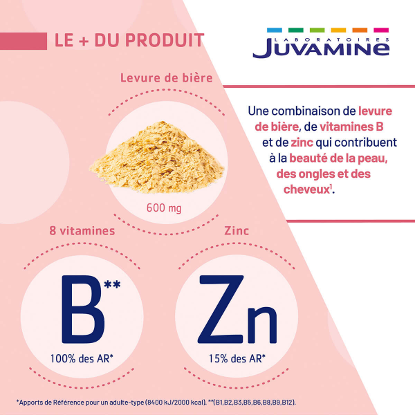 La levure de bière est un champignon dont les composants entretiennent la beauté des ongles, des cheveux et de la peau. Formule plus dosée (600 mg) et renforcée en 8 vitamines et en zinc. En savoir +