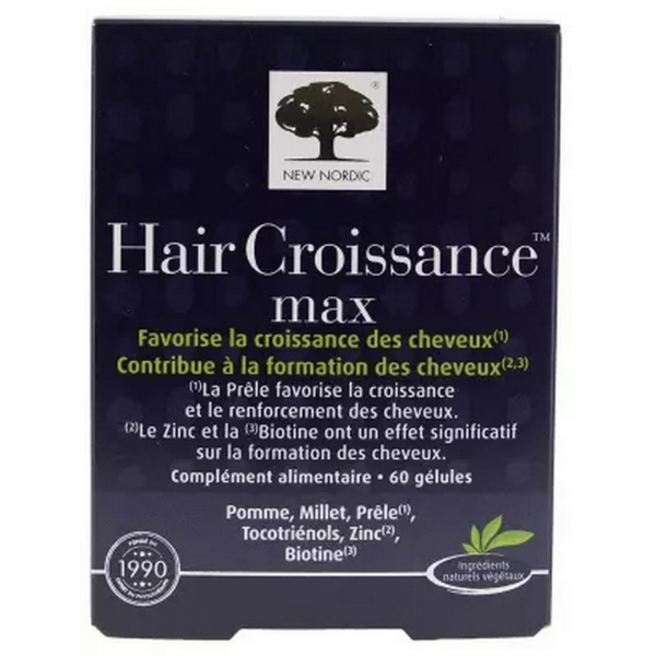 Extrait d-huile de fruit du Palmier (Elaeis guineensis L.) extrait de Pomme (Malus domestica Borkh.) extrait de Millet (Panicum milliaceum L.); enveloppe de la gélule hydroxypropylméthylcellulose; extrait de Prele (Equisetum arvense L.); L-methionine; agent de charge: cel- lulose microcristalline; minéral : oxyde de zinc ; anti-agglomérants: dioxyde de silicium sels de magnésium d-acides gras végétaux ; vitamine : biotine.