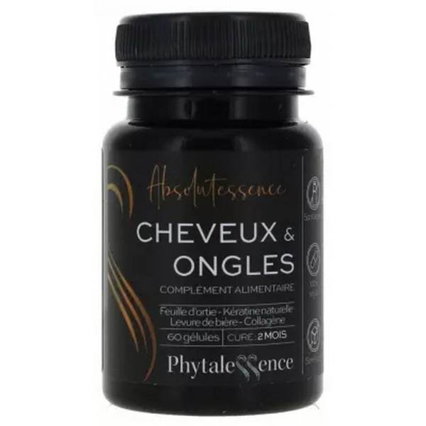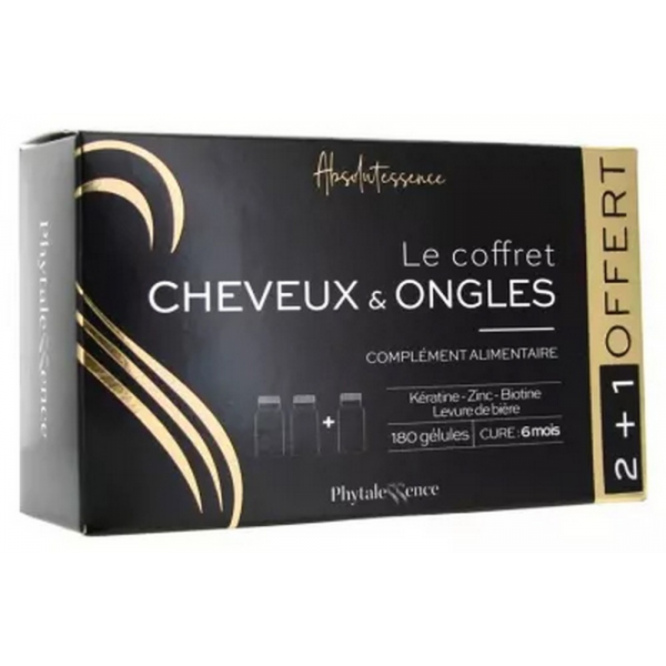 Le COFFRET CHEVEUX ET ONGLES ABSOLUTESSENCE est un complément alimentaire conçu pour apporter résistance, éclat et vitalité aux cheveux et aux ongles. Avec sa formule à base de gélules 100% végétales, ce lot de 3 x 60 gélules offre une solution naturelle pour prendre soin de vos cheveux et ongles, sans lactose, sans sucre, et sans OGM. Fabriqué en France, ce produit offre une composition riche en actifs tels que l'hydrolysat de kératine, le gluconate de zinc, la levure de bière, la L-cystine, la di-méthionine, l'hydrolysat de collagène et bien d'autres nutriments bénéfiques pour la santé capillaire et des ongles.