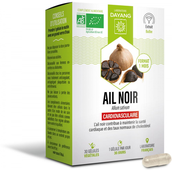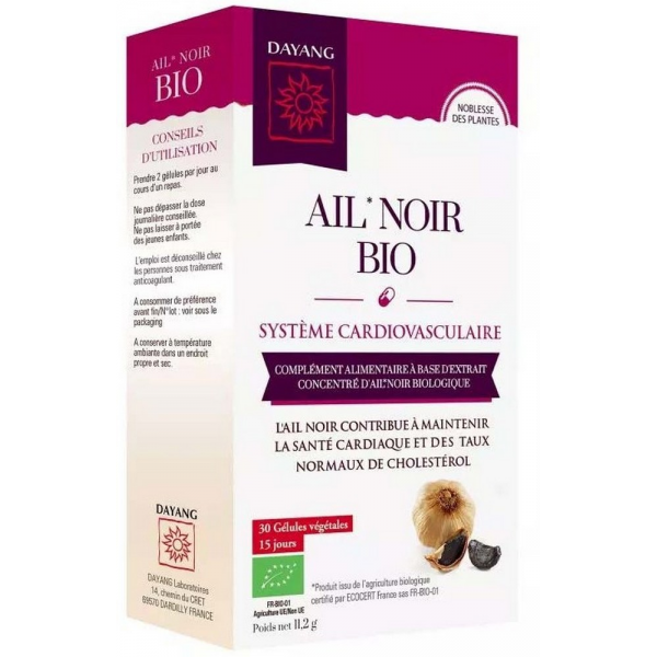 L'ail noir est obtenu par fermentation de l'ail blanc, plante vivace originaire d'Asie composée d'un bulbe principal central entouré de bulbes secondaires, les gousses d'ail. L'ail noir BIO Dayang est présenté sous forme d'un extrait sec qui concentre les principes actifs de la plante. Conditionné en France. La protection individuelle sous blister de chaque gélule assure une conservation idéale.