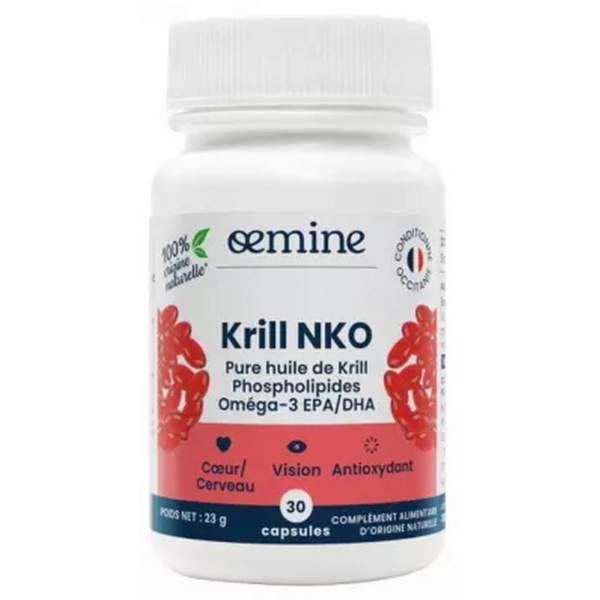 Le Oemine Krill NKO 30 Capsules est un complément alimentaire à base d'huile de krill NKO. Grâce à l'acide eicosapentaénoïque (EPA) et l'acide docosahexaénoïque (DHA) contenus dans cette huile, il contribue à une fonction cardiaque et à une vision normales. Chaque capsule contient 1500 mg d'huile de krill, 675 mg de phospholipides, 375 mg d'Oméga 3 (dont 202 mg d'EPA et 90 mg de DHA), ainsi que 69 mg de choline et 0,54 mg d'asthaxanthine. Ce complément est une excellente source d'acides gras essentiels.