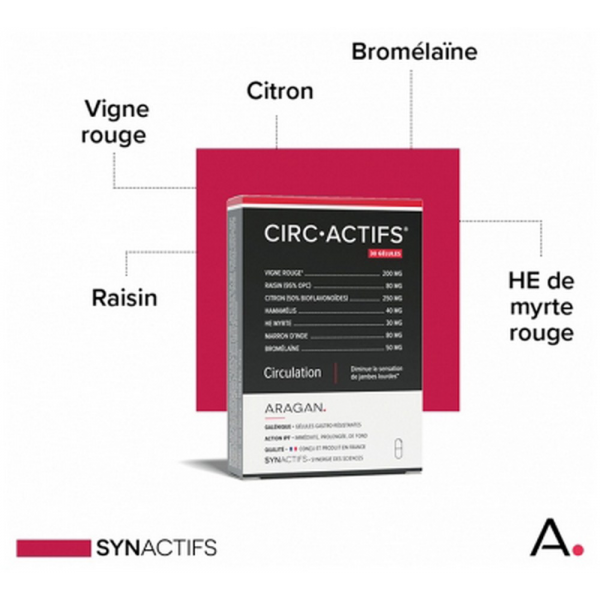 Le complément alimentaire Circactifs® est spécialement conçu pour améliorer la circulation sanguine et réduire la sensation de jambes lourdes. Sa formule innovante associe des actifs naturels tels que la vigne rouge le raisin le citron le sélénium l-hamamélis et l-huile essentielle de myrte ainsi que des vitamines essentielles. Grâce à cette combinaison Circactifs® aide à combattre les désagréments liés à une mauvaise circulation tels que les gonflements des jambes des pieds et des chevilles ainsi que la rétention d-eau. Cette formule complete est idéale pour soulager les symptomes de l’insuffisance veineuse et favoriser l-amélioration de la micro-circulation.
