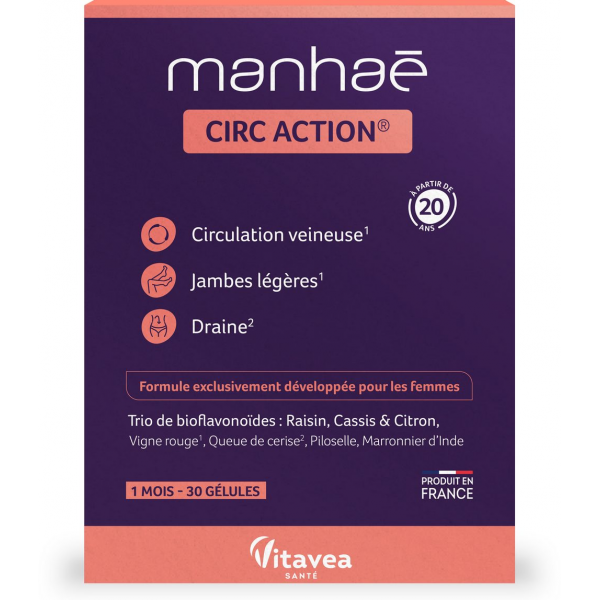 Manhaé Circ Action est la solution complète pour aider les femmes à retrouver des jambes plus légères. Manhaé Circ Action est un complément alimentaire, sa formule développée pour les besoins des femmes, repose sur une association unique : trio de bioflavonoïdes : extraits de raisin, cassis et citron, vigne rouge, queue de cerise, piloselle et marronnier d’Inde. A partir de 20 ans.