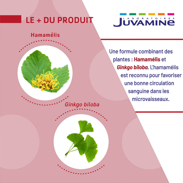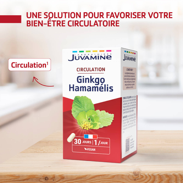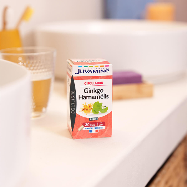 Complément alimentaire sous forme de gélules végétales, à base de ginkgo et d'hamamélis. Produit fabriqué en France. En savoir +