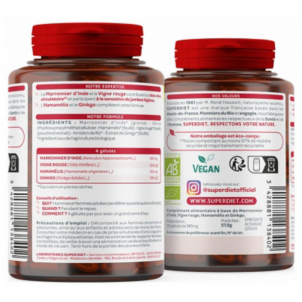 Marronnier d'Inde* (graine), Gélule de gélatine de poisson* (vinaigre d'alcool* - sirop de glucose* - anti-agglomérant : lécithine de soja*- huile de colza*), Hamamélis* (feuille), Vigne rouge* (feuille) (poudre et extrait) (support : maltodextrine*), Amidon de riz*, Extrait de Ginkgo* (feuille) (support : maltodextrine*). *Ingrédient issu de l'agriculture biologique.