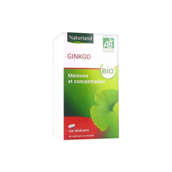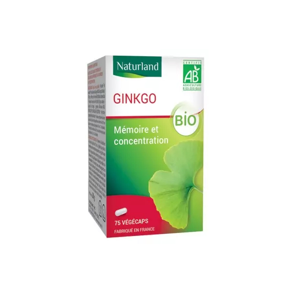 Le Naturland Ginkgo Bio 75 Végécaps est un complément alimentaire biologique qui vise à améliorer la mémoire et la concentration. Sa formule à base de feuille de ginkgo certifiée Agriculture Biologique est composée de poudre et d'extrait de feuille de ginkgo bio, de fibres de pomme bio, de concentré de riz bio et d'agent de charge : gomme d'acacia bio. Chaque gélule contient 190 mg de poudre de feuille de ginkgo, avec une teneur en lactones terpéniques de 0,19 mg, et 190 mg d'extrait de feuille de ginkgo, avec une teneur en lactones terpéniques de 0,76 mg. Ce produit est fabriqué en France et certifié par le contrôle FR-BIO-01.