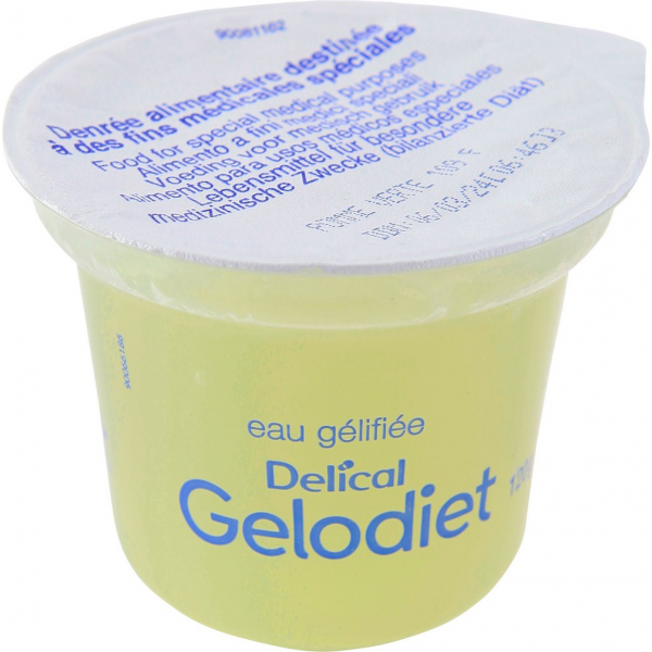 Delical Gelodiet Eau Gélifiée est une eau gélifiée facile à manger, destinée à des fins médicales spéciales, en cas de troubles de la déglutition. Elle est aussi disponibles en saveurs: cola, fraise, thé pêche, grenadine et raisin.