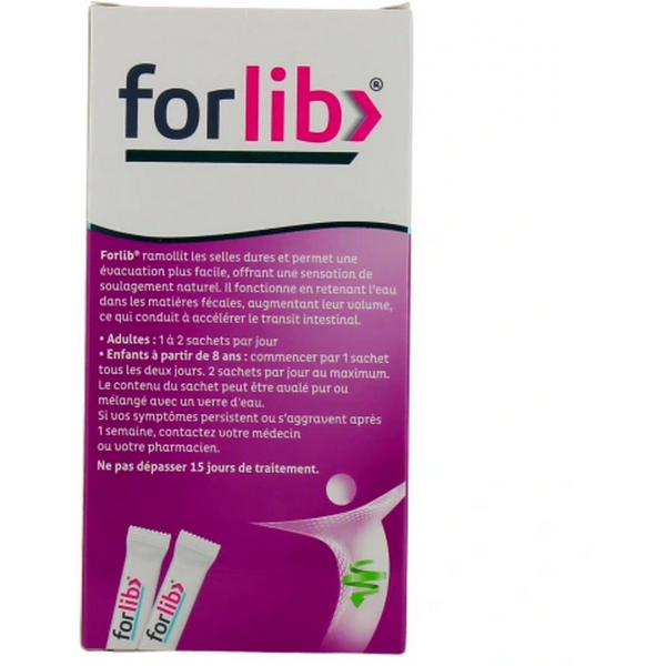 Le composant principal de Forlib est le macrogol 4000, un laxatif osmotique, également connu sous le nom de polyéthylène glycol (PEG). Le macrogol 4000 retient à l'eau dans les matières fécales. Il ramollit les selles dures et augmente leur volume. Cela conduit à accélérer le transit fécales. Il ramollit les selles dures et augmente leur volume. Cela conduit à accélerer le transit intestinal et à rendre l'évacuation plus facile, offrant une sensation de soulagement naturel. Le macrogol 4000 n'est pas absorbé par l'organisme et est excrété sous forme inchangée.