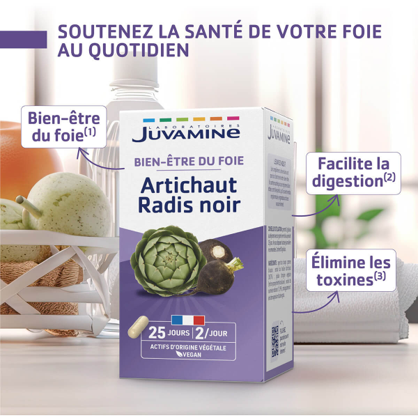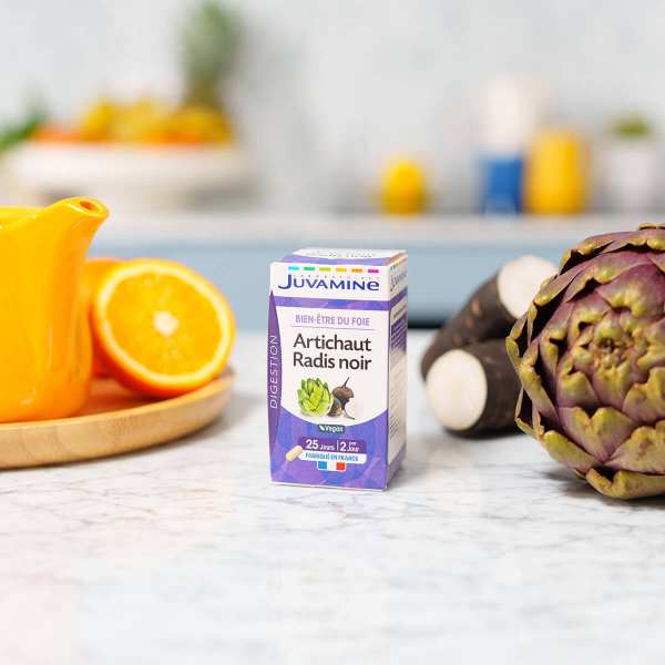 Le radis noir et l'artichaut sont deux plantes utilisées en phytothérapie pour leur propriétés digestives et détoxifiantes hépatiques. Le radis noir aide le drainage du foie. Il favorise l'élimination des déchets et des toxines produis lors de la digestion de repas riches et généreux (repas de fêtes de fin d'année par exemple). C'est un très bon détoxifiant, idéal pour les détox' conseillées lors des changements de saison.