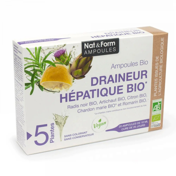 Nat&Form Draineur Hépatique Bio contient une association de 5 plantes, sous forme d'extrait aqueux ou de jus, reconnues bénéfiques pour drainer le foie. Le radis noir possède des vertus dépuratives, il aide à assurer le drainage du foie. Il aide à favoriser l'élimination des déchets et des toxines produites lors de la digestion de repas riches et généreux (repas de fêtes de fin d'année par exemple). Il aide à stimuler la sécrétion biliaire favorisant ainsi une bonne digestion. C'est un très bon détoxifiant, idéal pour les détox conseillées lors des changements de saison. Le jus de citron possède de multiples vertus, c'est un très bon détoxifiant. L'artichaut contient des substances amères qui aident au fonctionnement du foie. Il aide à stimuler la sécrétion biliaire et à apporter un effet laxatif léger qui aide à lutter contre les états d'engorgement intestinal. Il joue également un rôle dans la régénération des cellules hépatiques et offre une action protectrice. Le romarin aide au bon fonctionnement du foie et agit en tant que draineur hépatique. Sans colorant, sans conservateur, ce complément alimentaire convient dans le cadre d'un régime végan.