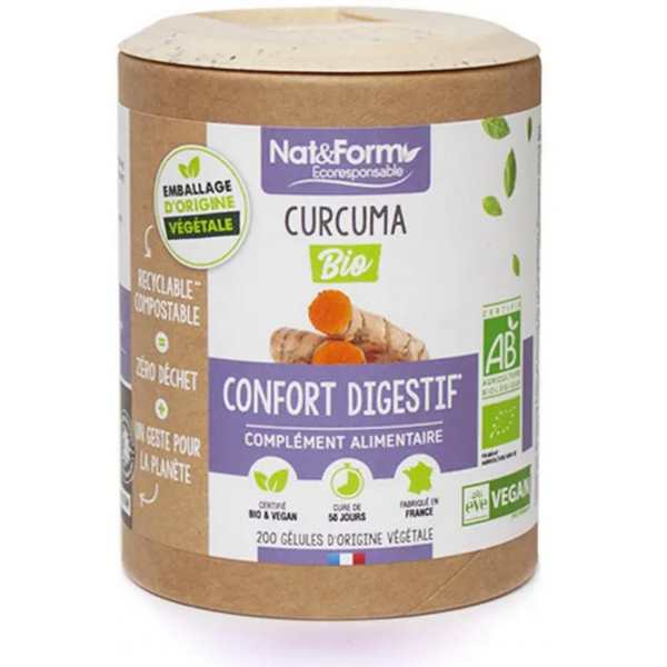 Nat&Form vous propose ce complément alimentaire Bio à base de curcuma et pipérine. Le curcuma, appelé Safran des Indes, contient des curcuminoïdes dont la curcumine, molécule active du curcuma.