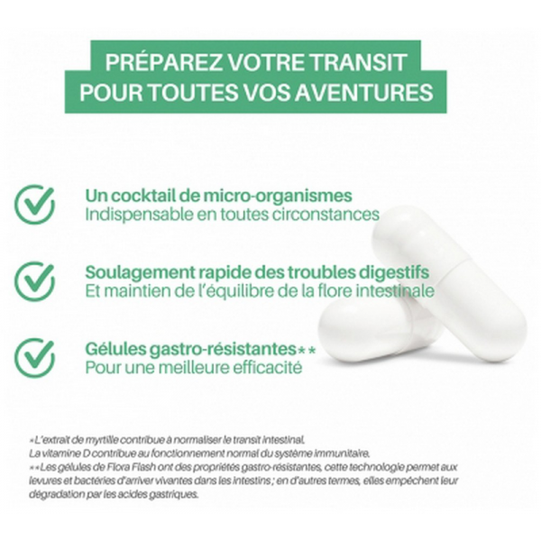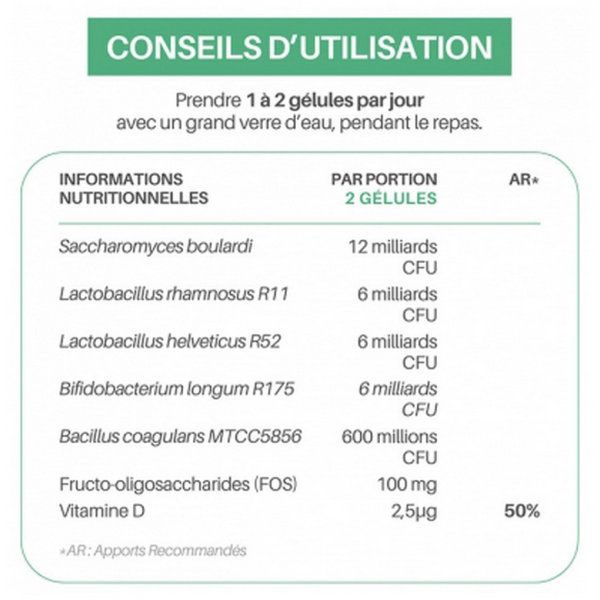 Ingrédients par portion journaliere recommandée (2 gélules) : 12 milliards de cellules de Saccharomyces boulardii. Gélule : hydroxypropylméthylcellulose. Maltodextrine. 100 mg de fructo-oligosaccharides. 6 milliards de cellules de Lacticaseibacillus rhamnosus R-11. 6 milliards de cellules de Bifidobacterium longum R-175. 6 milliards de cellules de Lactobacillus helveticus R-52. Antiagglomérant : sels de magnésium d-acides gras. Épaississant : pectines. Extrait de myrtille (Vaccinium myrtillus L.). Antiagglomérant : dioxyde de silicium. 600 millions de cellules Bacillus coagulans MTCC5856. Antioxydant : acide ascorbique. 25mcg de vitamine D (cholécalciférol 50% AR).