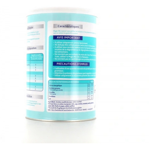 Denrée alimentaire destinée à des fins médicales spéciales à utiliser uniquement comme épaississant. Aliment incomplet, ne doit pas être utilisé comme seule source d'alimentation. A utiliser sous contrôle médical pour les besoins nutritionnels en cas de troubles de la déglutition ou de régurgitation.