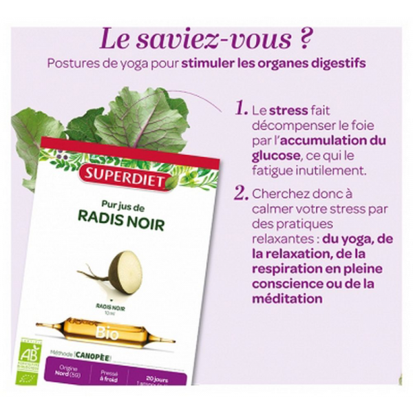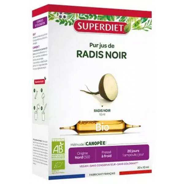 Racine caractérisée par sa chair blanche enveloppée d’une peau noire et sa saveur particulière, le Radis noir est un légume traditionnellement utilisé depuis des siècles. Il est également connu sous le nom de Radis d’Hiver du fait sa récolte tardive durant les mois d’automne. C’est en 1973 qu’a eu lieu la première extrraction de notre pur jus. Cultivé en Normandie et dans le Nord de la France, selon les normes de l’agriculture biologique, le Radis noir est récolté et pressé à froid dès son arrivée sur notre site : nos équipes vous garantissent ainsi un pur jus bio. Le radis noir des Laboratoires SUPERDIET est le témoignage d’un savoir-faire authentique.
