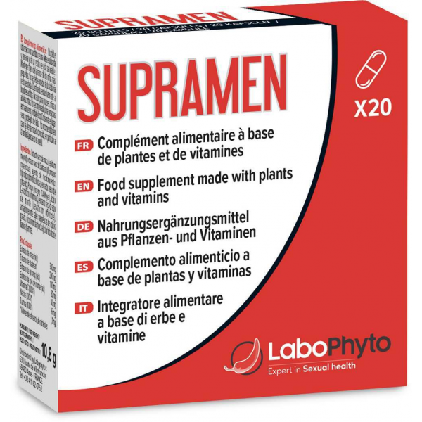 Le Labophyto Supramen 20 Gélules est un complément alimentaire spécialement conçu pour renforcer les performances sexuelles masculines. Sa formule à base de ginseng, de livèche, de maca et d'asparagus racemosus, fabriquée en France, aide à améliorer l'érection, à tonifier le corps, à stimuler le désir sexuel et à retarder l'éjaculation.