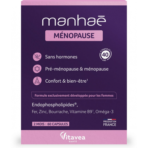 Manhaé est LA solution d'origine naturelle sans aucune source d'hormones de synthèse ou végétales (lin, sauge, fenouil, soja, houblon, trèfle...). Elle accompagne les femmes dans leurs modifications métaboliques en période de pré-ménopause ou ménopause.