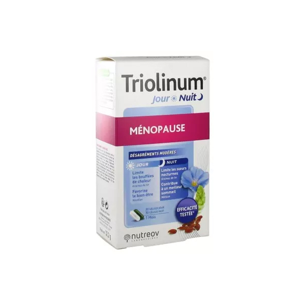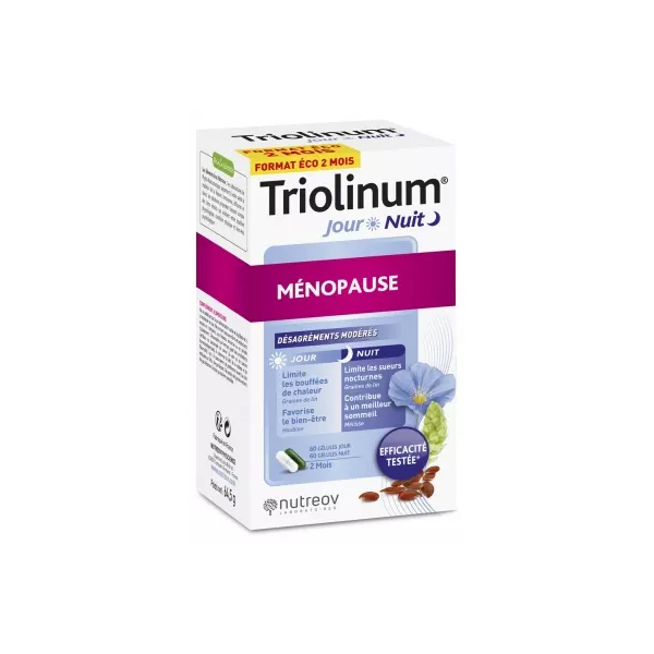 Le TRIOLINUM JOUR/NUIT est un complément innovant des Laboratoires Nutreov conçu pour les femmes en période de périménopause et ménopause. Sa formule unique, testée cliniquement, offre une action ciblée sur 24 heures. La formule JOUR contient des lignans (SDG) de l'extrait de graines de lin, de la vitamine D3 et du calcium pour contribuer au bien-être durant la ménopause, tandis que la formule NUIT favorise le bien-être pendant la nuit grâce aux lignans de l'extrait de graines de lin et à la mélisse, reconnue pour améliorer le sommeil. De plus, une efficacité globale ressentie sur les désagréments de la ménopause a été mesurée à 84% lors d'une étude clinique.