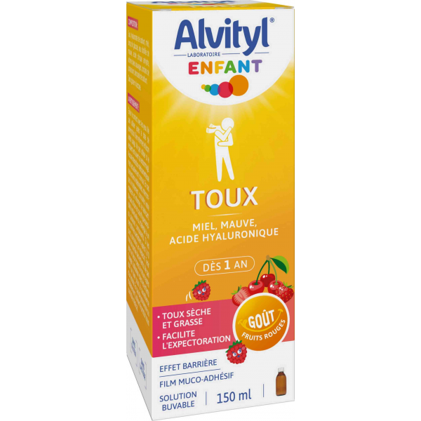 Alvityl® Enfant Toux combine les bienfaits du miel et de l’acide hyaluronique pour créer un film mucoadhésif protecteur qui agit comme une barrière contre les irritants extérieurs. Cette action protectrice aide à apaiser les voies respiratoires et réduit la fréquence et l’intensité de la toux, qu’elle soit sèche ou grasse. De plus, ce film agit en maintenant l’hydratation de la muqueuse respiratoire, facilitant ainsi l’expectoration naturelle du mucus et contribuant à dégager les voies respiratoires.