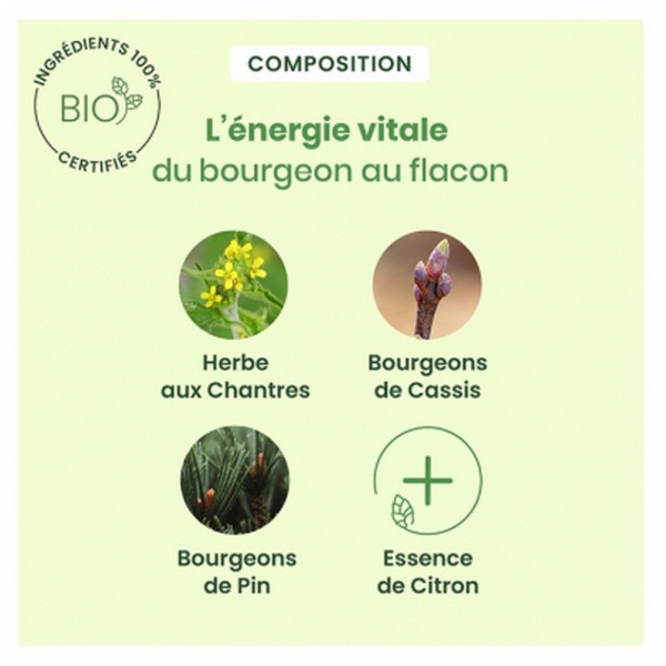 Gomme arabique, sirop d’agave, sirop de sureau, teinture mère d’herbe aux chantres, macérat glicériné de bourgeons de cassis et de pin, essence de citron, miel.