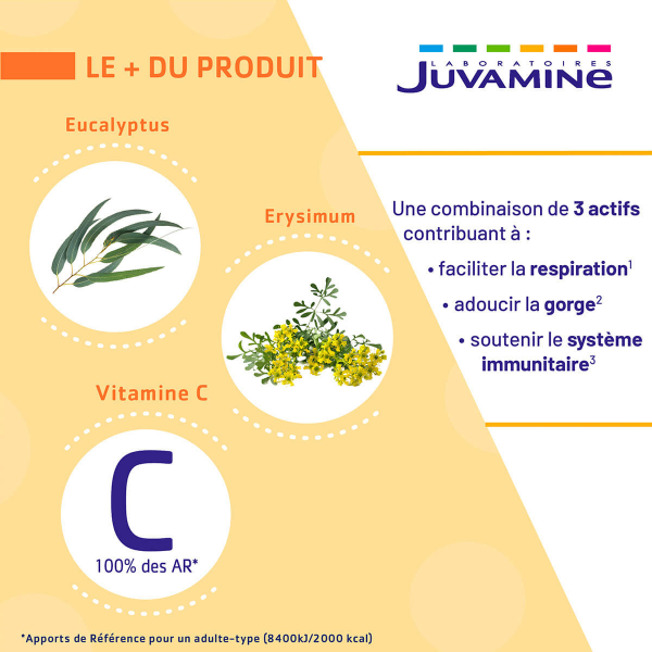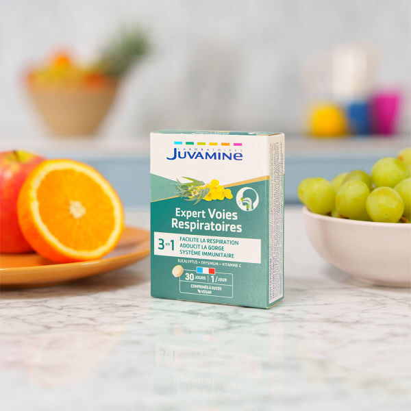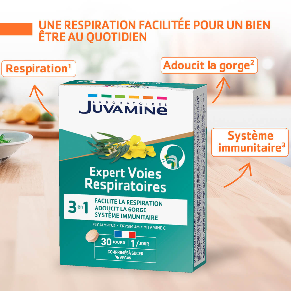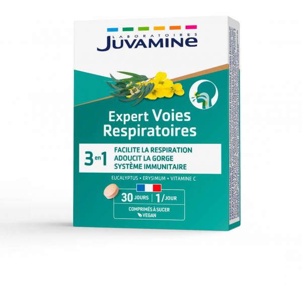 Juvamine Expert Voies Respiratoires 3en1 30 Comprimés à Sucer est un complément alimentaire formulés à base de plantes et vitamine C, pour le confort des voies respiratoires. En savoir +