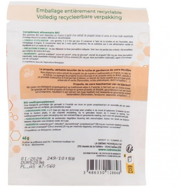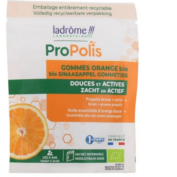 Découvrez les gommes Ladrôme Propolis Orange Douces & Actives Bio, un remède naturel pour apaiser les maux de gorge et rafraîchir l'haleine. Ces gommes allient savamment la propolis aux délicieuses notes d'orange pour offrir une solution naturelle et efficace dès l'âge de 6 ans. Grâce à leurs propriétés apaisantes, assainissantes et protectrices, ces gommes constituent un allié de choix pour une gorge confortable au quotidien. Certifié par FR-BIO-01 et fabriqué en France, ce produit allie qualité, efficacité et plaisir gustatif.