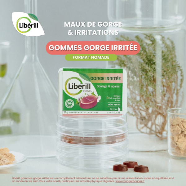 Les gommes Liberill, à base d'extrait de racine de guimauve et d'huiles essentielles, apportent un soulagement rapide aux irritations de la gorge, du pharynx et des cordes vocales. Ce complément alimentaire, composé d’ingrédients naturels tels que la gomme d’acacia, est conçu pour apaiser efficacement les inconforts de la gorge.