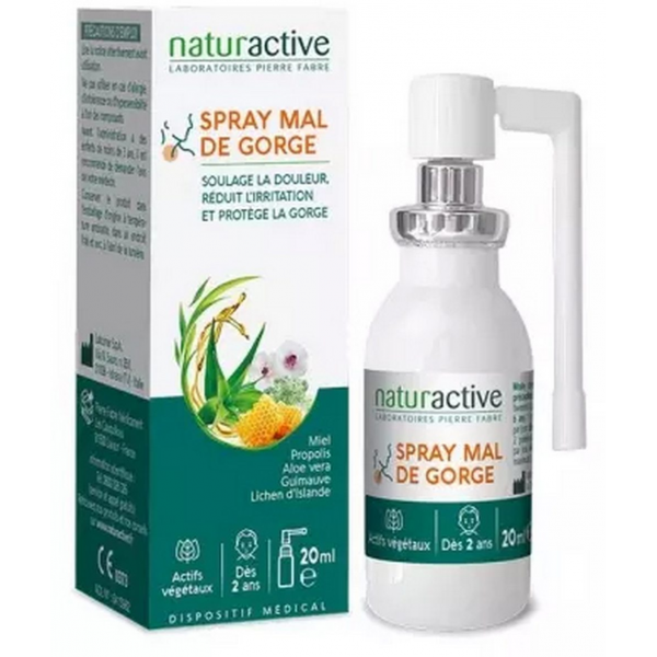 Le Spray gorge Naturactive est destiné à être pulvérisé dans la cavité buccale. Il est conseillé pour le confort de la gorge. Sa formule est l’association d’extraits secs de Plantain et de Canneberge et des arômes naturels d'huiles essentielles.