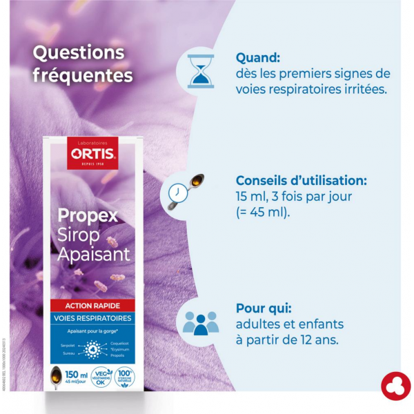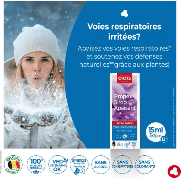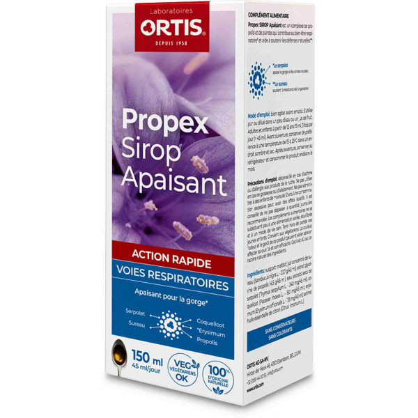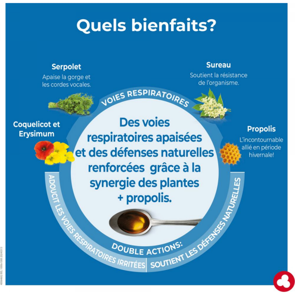 Le Propex Sirop Apaisant offre une double action bénéfique. D'une part, il procure un véritable bien-être respiratoire en apaisant la gorge et les cordes vocales grâce à l'action du serpolet. D'autre part, sa composition naturelle favorise le renforcement des défenses naturelles de l'organisme, contribuant ainsi à une meilleure résistance face aux agressions hivernales. Grâce à sa synergie de plantes judicieusement dosée, ce sirop constitue une alliée précieuse pour affronter les désagréments liés à la saison froide.