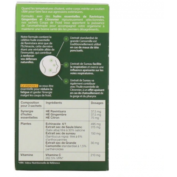 Chaque portion journalière (3 sachets) contient 150 mg d’Huiles Essentielles 100 % biologiques (Ravintsara, Gingembre, Citronnier), 990 mg d’extraits de plantes (Échinacée, Sureau, Grande Camomille, Saule blanc), ainsi que 210 mg de vitamine C d’origine végétale. Composition pour 3 sachets : Maltodextrine; Poudre microencapsulée d’huiles essentielles (Maltodextrine; Acacia gum); Huiles essentielles de Citron (Citrus limon peel oil - 75 mg), Ravintsara (Cinnamomum camphora leaf oil - 37,50 mg) et Gingembre (Zingiber officinale root oil - 37,50 mg)); Extrait sec de parties aériennes d’Echinacée (Echinacea purpurea) 495 mg, dont 19,80 mg polyphénols; Extrait sec d’écorce de Saule blanc (Salix alba) 315 mg, dont 94,50 mg de Salicine; Vitamine C; Extrait sec de baies de Sureau noir (Sambucus nigra) 150 mg, dont 9 mg anthocyanines; Extrait sec de parties aériennes de Grande Camomille (Chrysanthemum parthenium) 30 mg, dont 450 μg de parthénolides; Edulcorant : Glycosides de stéviol issus de la Stevia.
