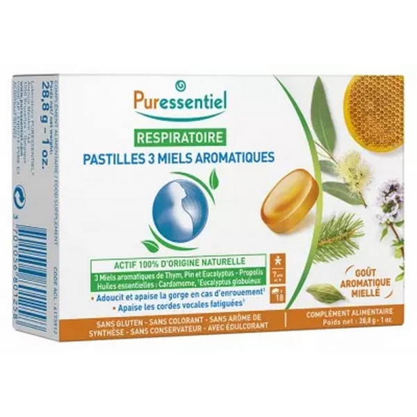 Les 1ers froids, les changements de température, la forte sollicitation de la voix (chanteurs, professeurs, animateurs, coachs sportifs...) mettent à rude épreuve la gorge et les cordes vocales. Les pastilles aux 3 miels aromatiques Puressentiel, à l'actif 100% d'origine naturelle sont indiquées pour adoucir la gorge en cas d'enrouement et apaiser les cordes vocales fatiguées (eucalyptus globuleux).