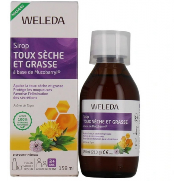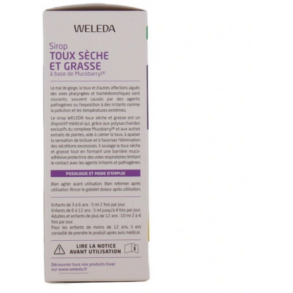 Le sirop WELEDA toux sèche et grasse est un dispositif médical qui, grâce aux polysaccharides exclusifs du complexe Mucobarryl® et aux autres extraits de plantes, aide à calmer la toux, à apaiser la sensation de brûlure et à favoriser l'élimination des sécrétions excessives. Il soulage la toux sèche et grasse tout en formant une barrière mucoadhésive protectrice des voies respiratoires limitant le contact avec les agents irritants et pathogènes.