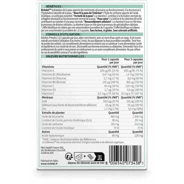 Richelet Hydratation de la Peau, enrichi en acide hyaluronique, en huile de bourrache et en huile de carthame, propose une solution complète pour une peau éclatante et en pleine forme. Chaque capsule renferme une combinaison d'ingrédients actifs soigneusement sélectionnés. L'huile de carthame, riche en acide linoéique, pénètre en profondeur pour nourrir votre peau. Grâce à la présence de vitamine C, ce produit favorise la production de collagène, essentiel à la fermeté et à l'élasticité de la peau. Votre peau mérite le meilleur, c'est pourquoi ce soin en capsule ne s'arrête pas là. Biotine, vitamines B2 et B3 s'allient pour maintenir une peau en bonne santé.