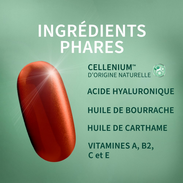 Huile de graines de bourrache (Borago officinalis L.) ; gélatine (bovine) ; affermissant : glycérol ; huile de graines de carthame (Carthamus tinctorius L.) ; ascorbate de calcium (vitamine C) ; hyaluronate de sodium (acide hyaluronique) ; épaississant : mono- et diglycérides d'acides gras ; levure enrichie en sélénium (sélénium) ; émulsifiant : lécithines ; D-alpha-tocophérol (vitamine E d'origine naturelle) ; levure en poudre ; sulfate de zinc (zinc) ; nicotinamide (niacine) ; colorant : oxydes et hydroxydes de fer ; riboflavine (vitamine B2) ; palmitate de rétinyle (vitamine A) ; D-biotine (biotine) ; iodure de potassium (iode) ; cholécalciférol (vitamine D3)