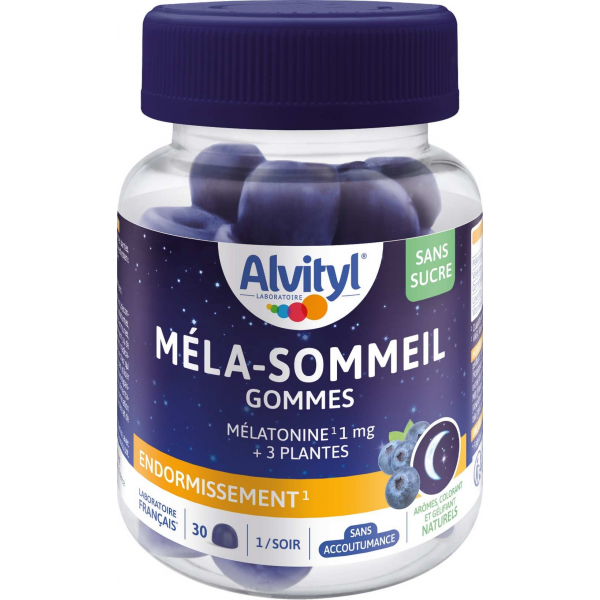 Alvityl Méla-Sommeil est un complément alimentaire en gommes associant 3 plantes et 1 mg de mélatonine.